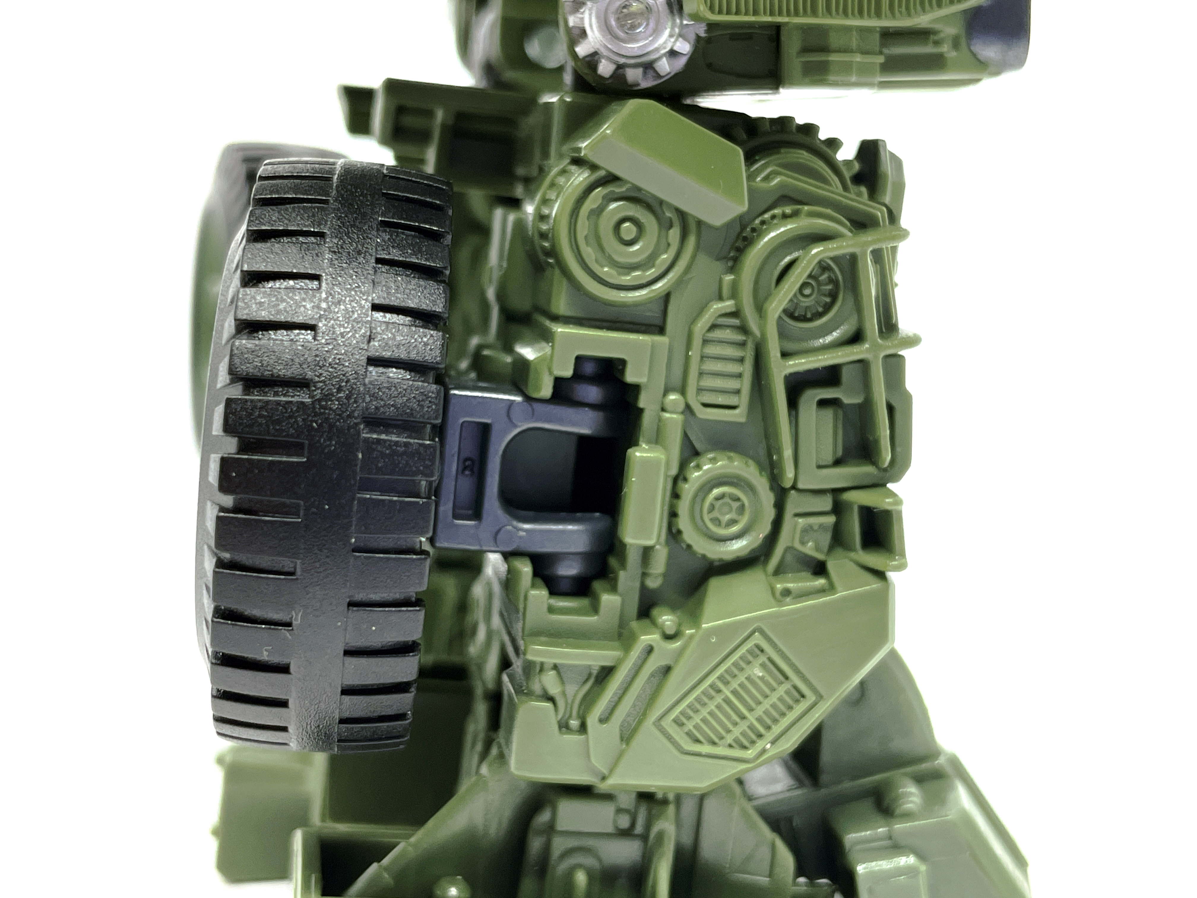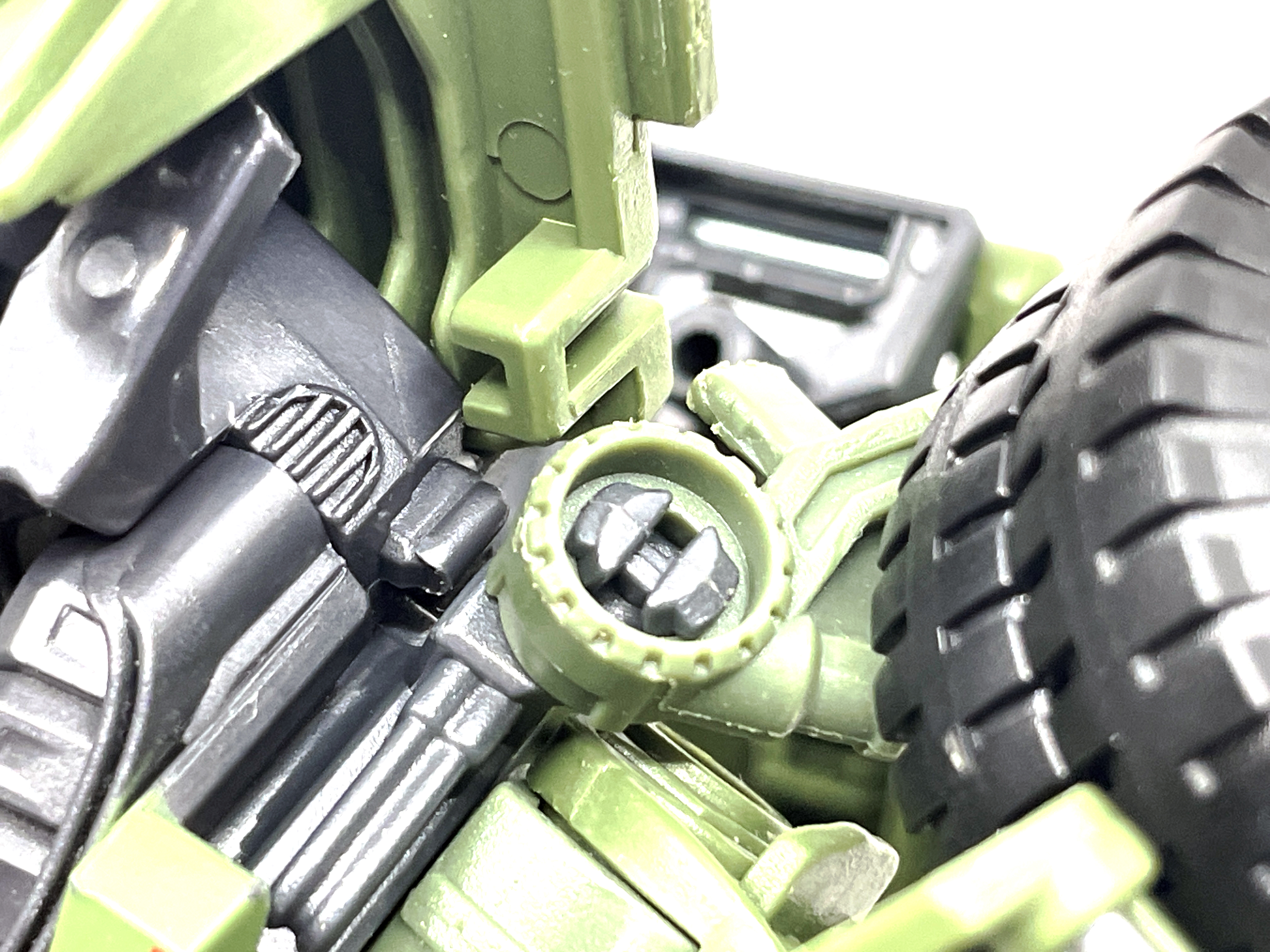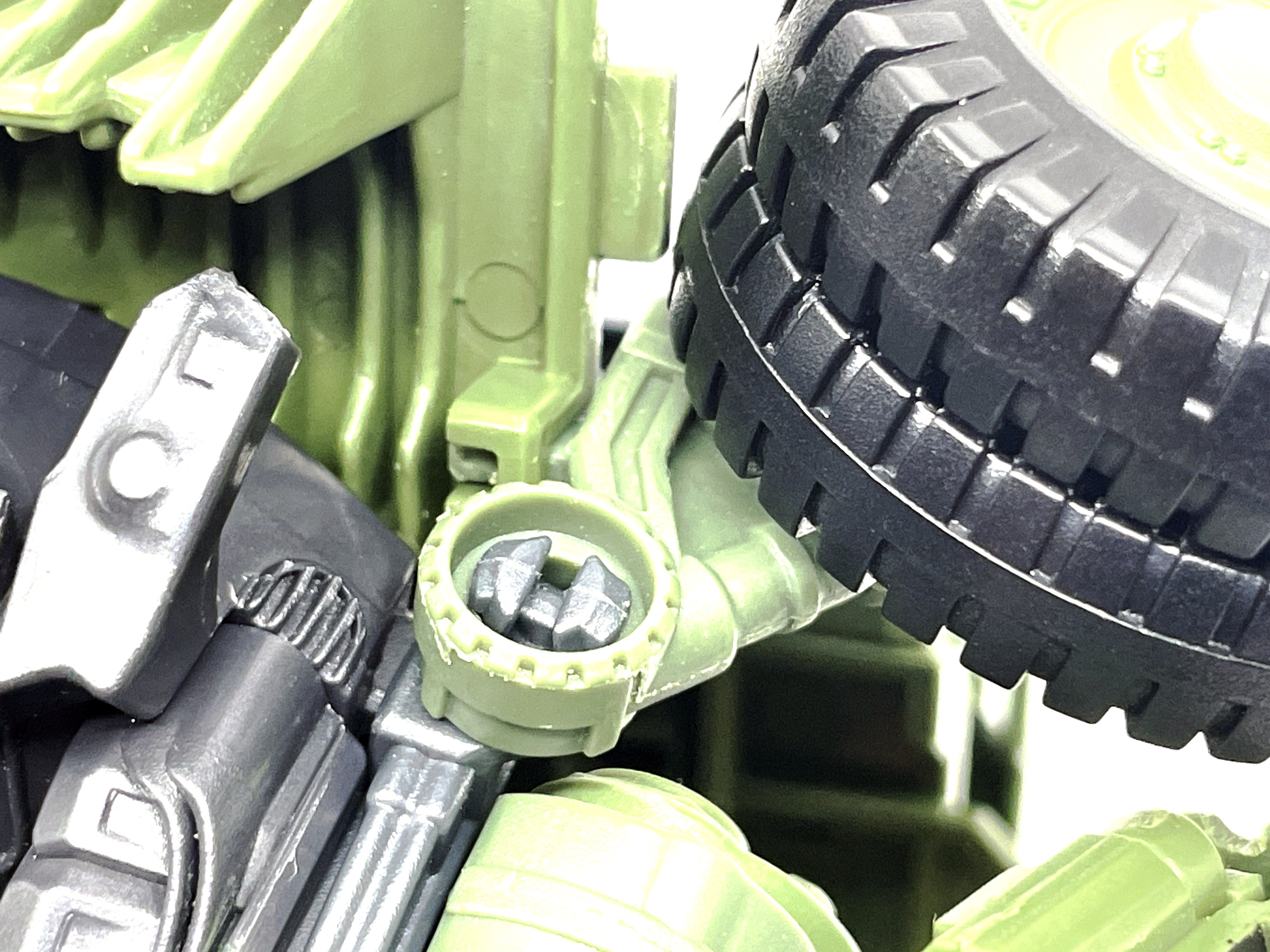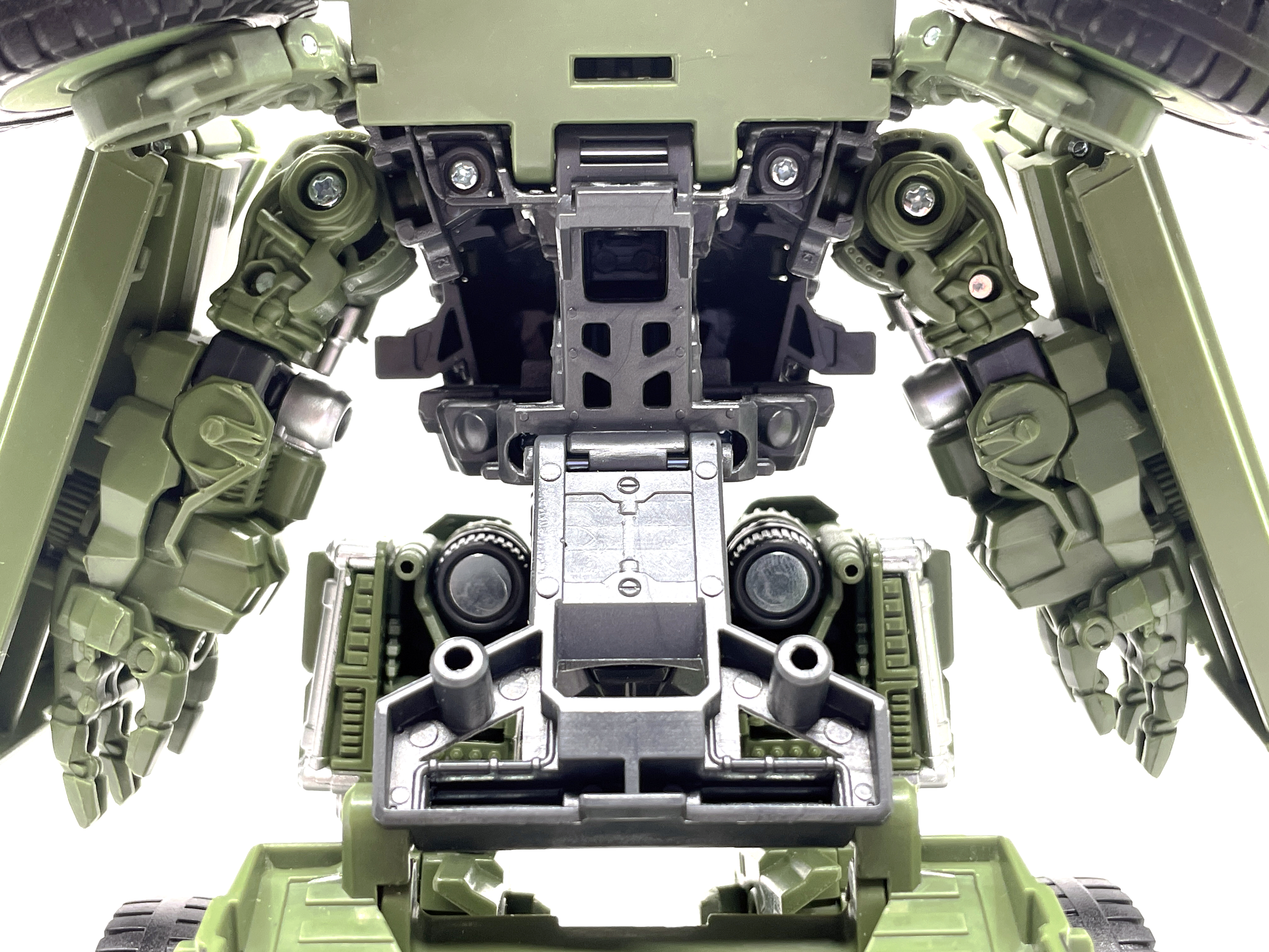 우선 덤프 트럭 후반의 연결부를 분리. 로봇 가슴에 부착된 전면부 바퀴를 분리해줍니다.