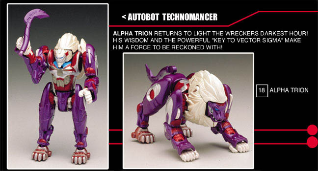 알파 트라이온이 사자로 변신하는 아이디어는 <타이탄스 리턴>에서 사용된 것으로 알려졌지만, 3H 코믹스에서 <비스트 머신즈>의 스널 완구를 기반으로 캐릭터를 만든 것이 시초였습니다. 해당 완구는 프로토타입이 만들어졌지만, 끝내 출시되지 못했습니다.