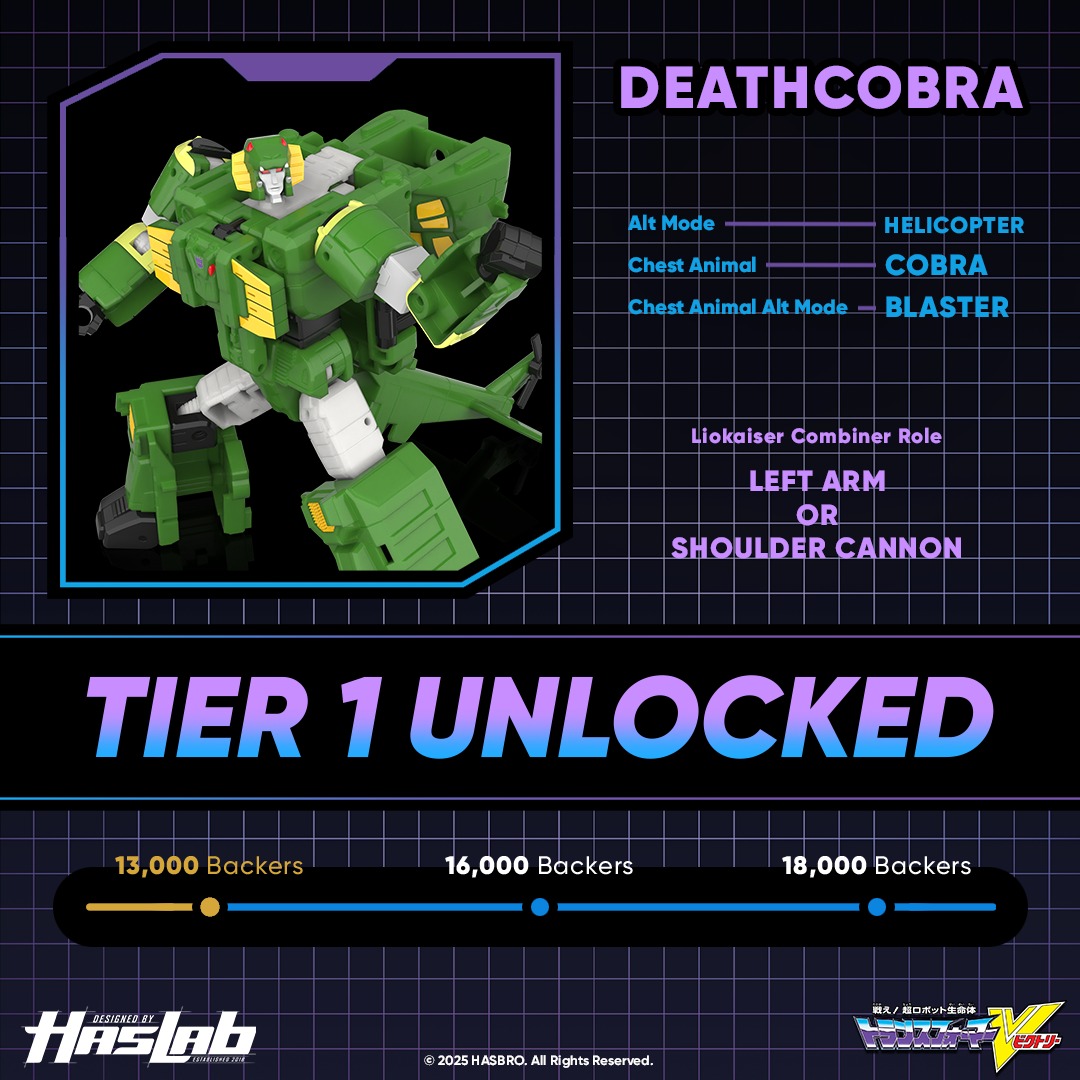 해즈브로의 크라우드 펀딩 프로젝트인 <해즈랩>의 <트랜스포머 레거시> 라이오카이저의 1티어 보상인 데스코브라가 해금되었음을 알립니다. 북미 펀딩 만으로 1티어 보상을 성공적으로 달성하였습니다.
