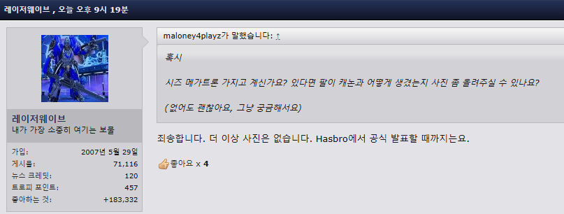 하지만, 이번 경우 장물을 구매한 유출자들이 해즈브로의 압박을 받았는지 공식 방송 일정 전까지 완전히 공개하지 않는다는 약속을 시행하는 중입니다. 과거 아무 제품이나 막 올라오던 유출판을 생각하면 꽤 특이한 케이스지만, 해즈브로측에서 86 메가트론이 상당히 중요한 아이템이라 생각하는 것으로 보입니다.