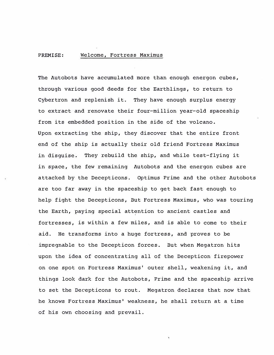 이 구상안의 포트리스 맥시머스는 최종 전투 후, 어떻게 된다는 언급이 없습니다. 스카이파이어처럼 일차적으로 퇴장했다가 다시 복귀하는 전개일수도 있고, 오메가 슈프림의 역할을 대체하는 걸지도 모르지요. 이는 포트리스 맥시머스 캐릭터의 완구가 기획되지 않았다는 점을 생각할 수 있는데, 비슷하게 알파 트라이온, 데브콘, 엘리타 원 역시 당시엔 완구가 없는 애니메이션 오리지널 캐릭터로 나왔던 것을 생각하면, 시즌 2 당시 구상된 포트리스 맥시머스 역시 비슷한 케이스라 생각할 수 있습니다.