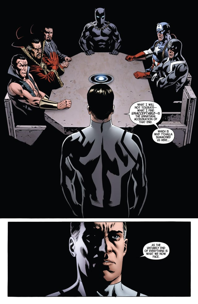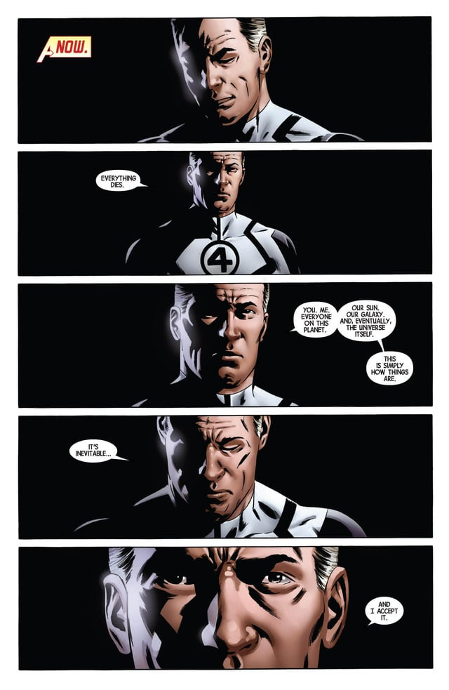 약간 차이가 있긴 하지만, <마블 코믹스>에서 묘사된 <시크릿 워즈>의 전조인 인커전 사태가 발생했을 때, 리드 리처즈가 말한 "모든 것은 죽어. (중략) 이건 필연적인 일이야. 난 받아들이기로 했어"와 거의 동일한 대사입니다.