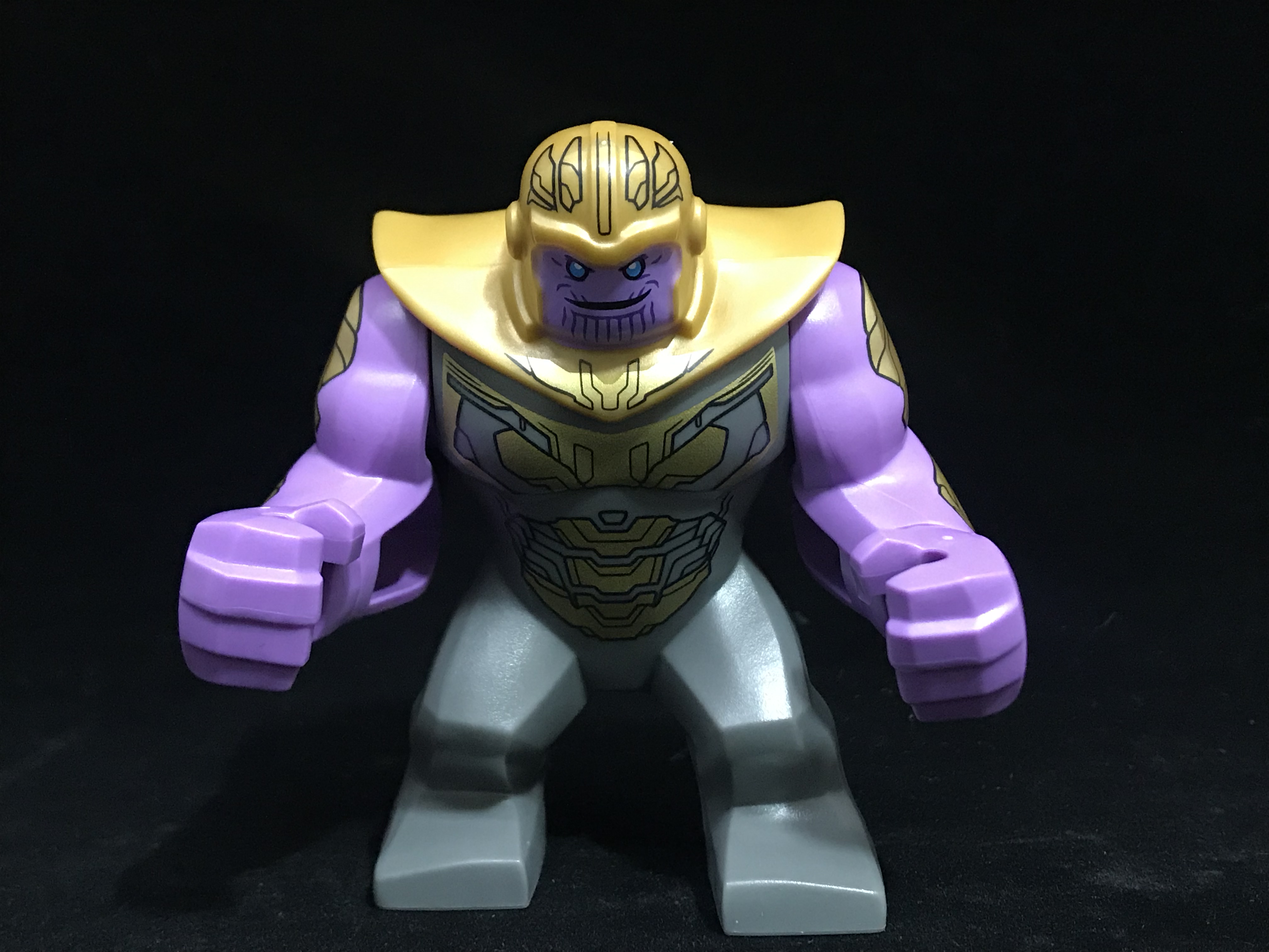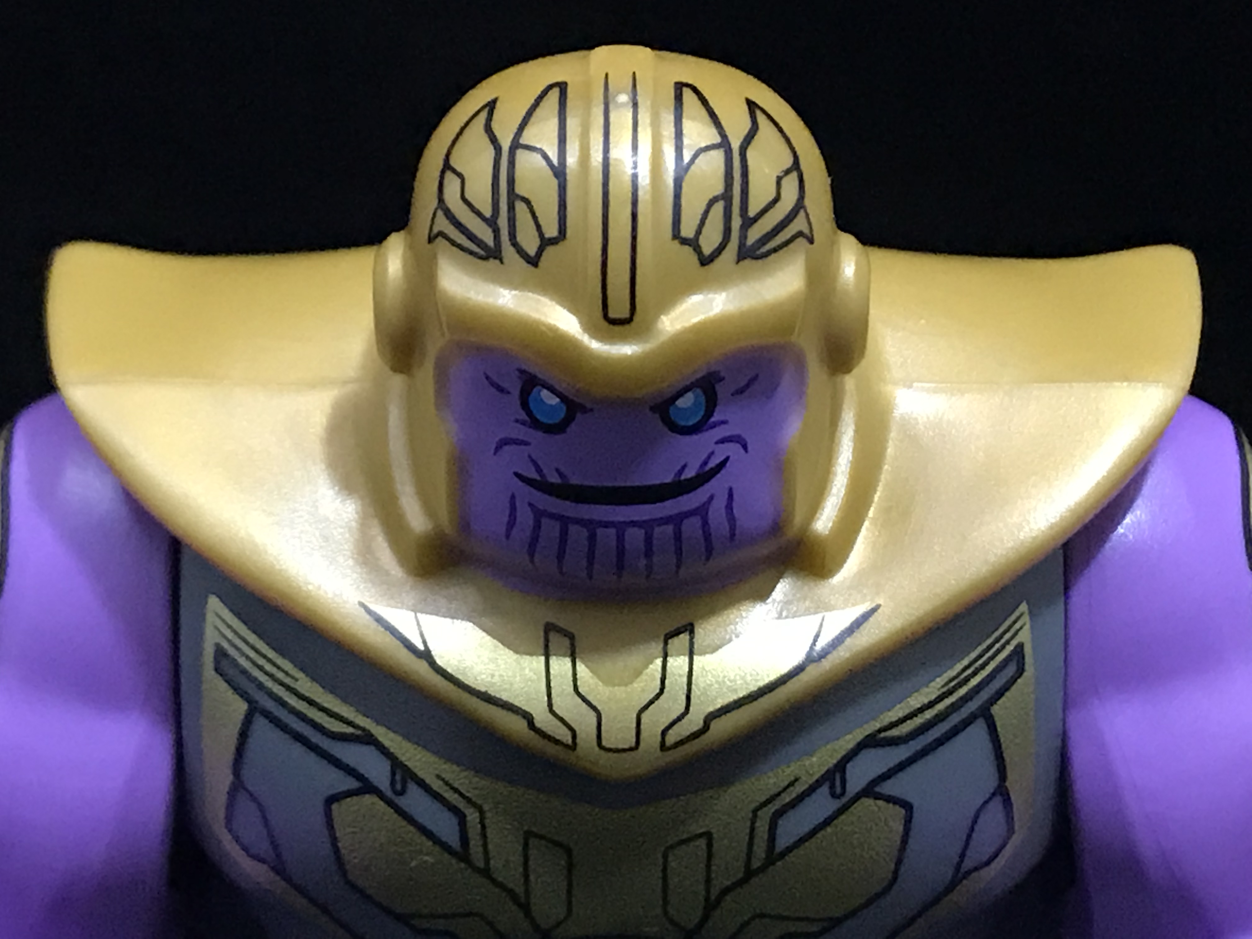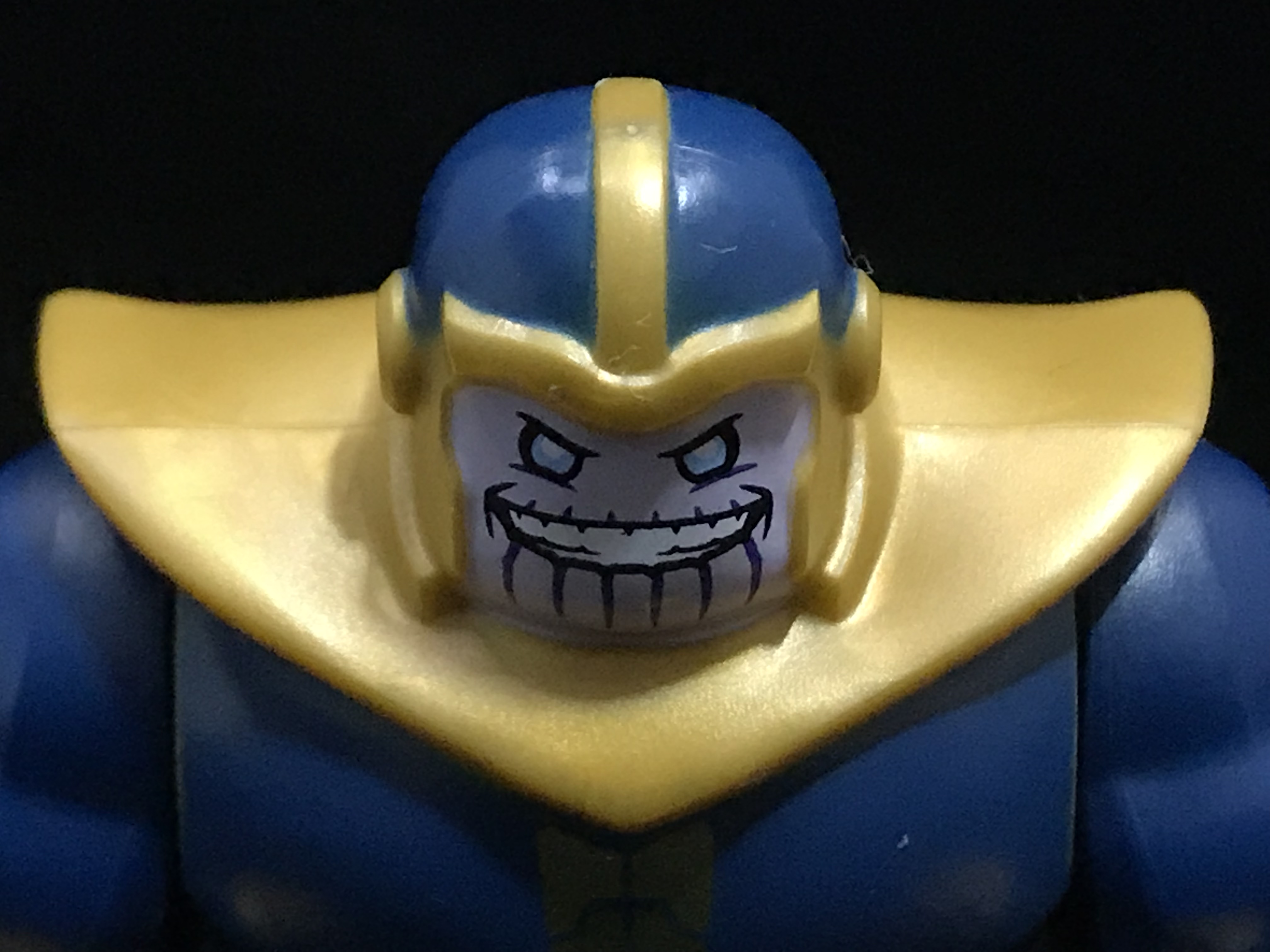 얼굴 접사. 다른 타노스 미니피겨들과 다르게, 미소를 짓고 있는 모습입니다.