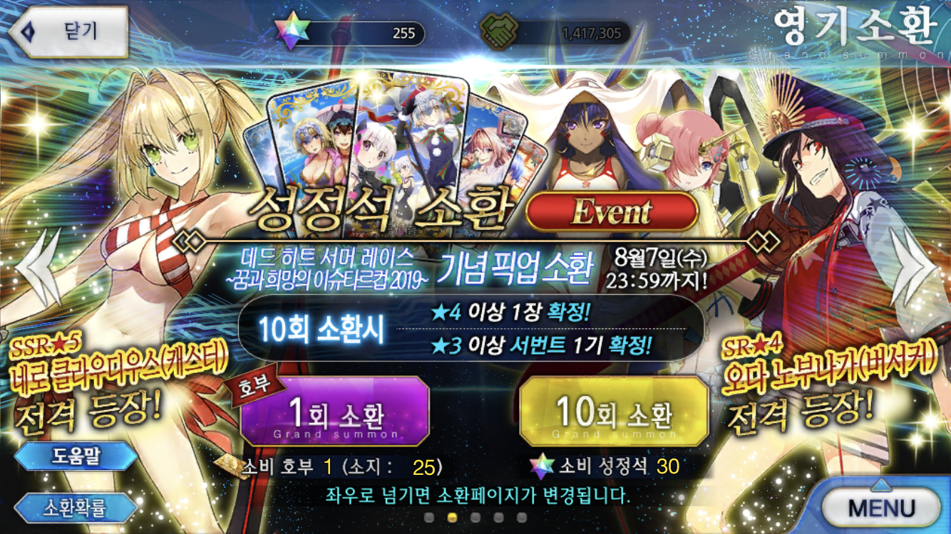 남은 돌과 호부. 수영복 오다 노부나가(일명, 록부)를 제외한 1차 픽업은 성공적으로 끝났습니다. 컬렉터 기질이 있어 네로 하나 대신 록부가 나왔으면 하는 바가 있지만, 아쉬운 건 아쉬운대로…