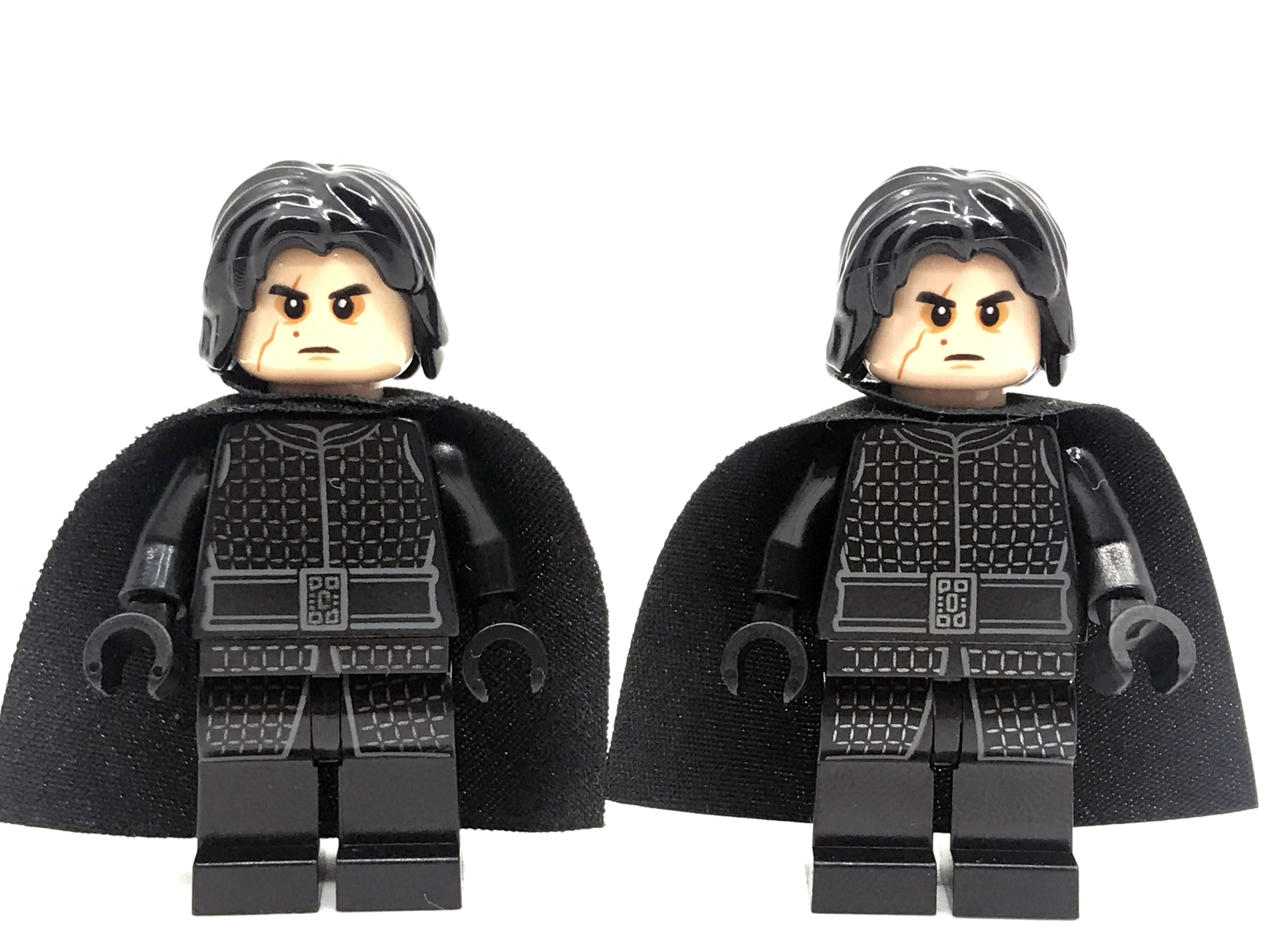 75179 타이 사일런서의 카일로 렌 미니피겨(좌측)과 비교. 새로운 헬멧과 헤어 부품이 없었다는 것을 제외하면 모든 사양이 동일합니다.