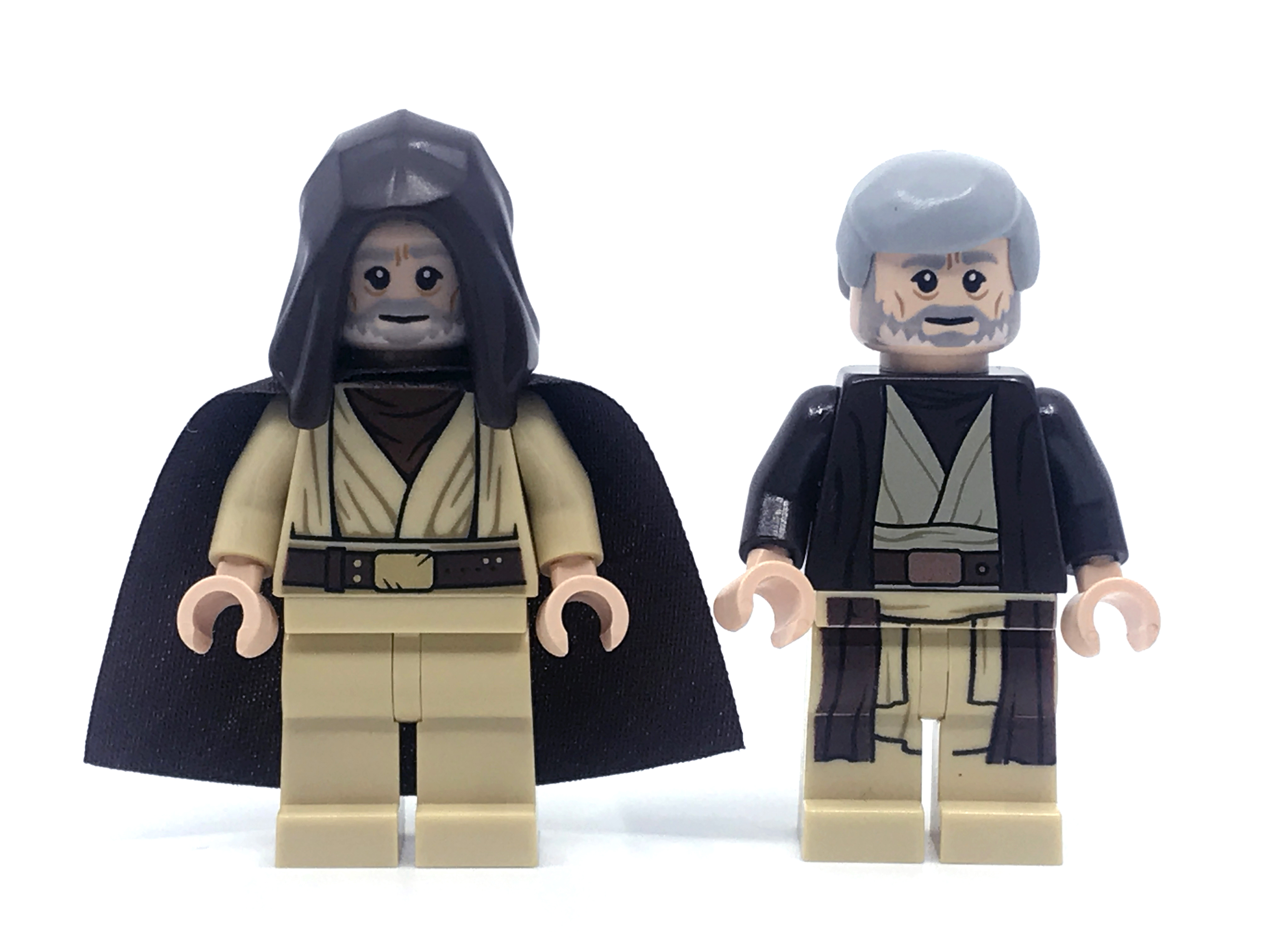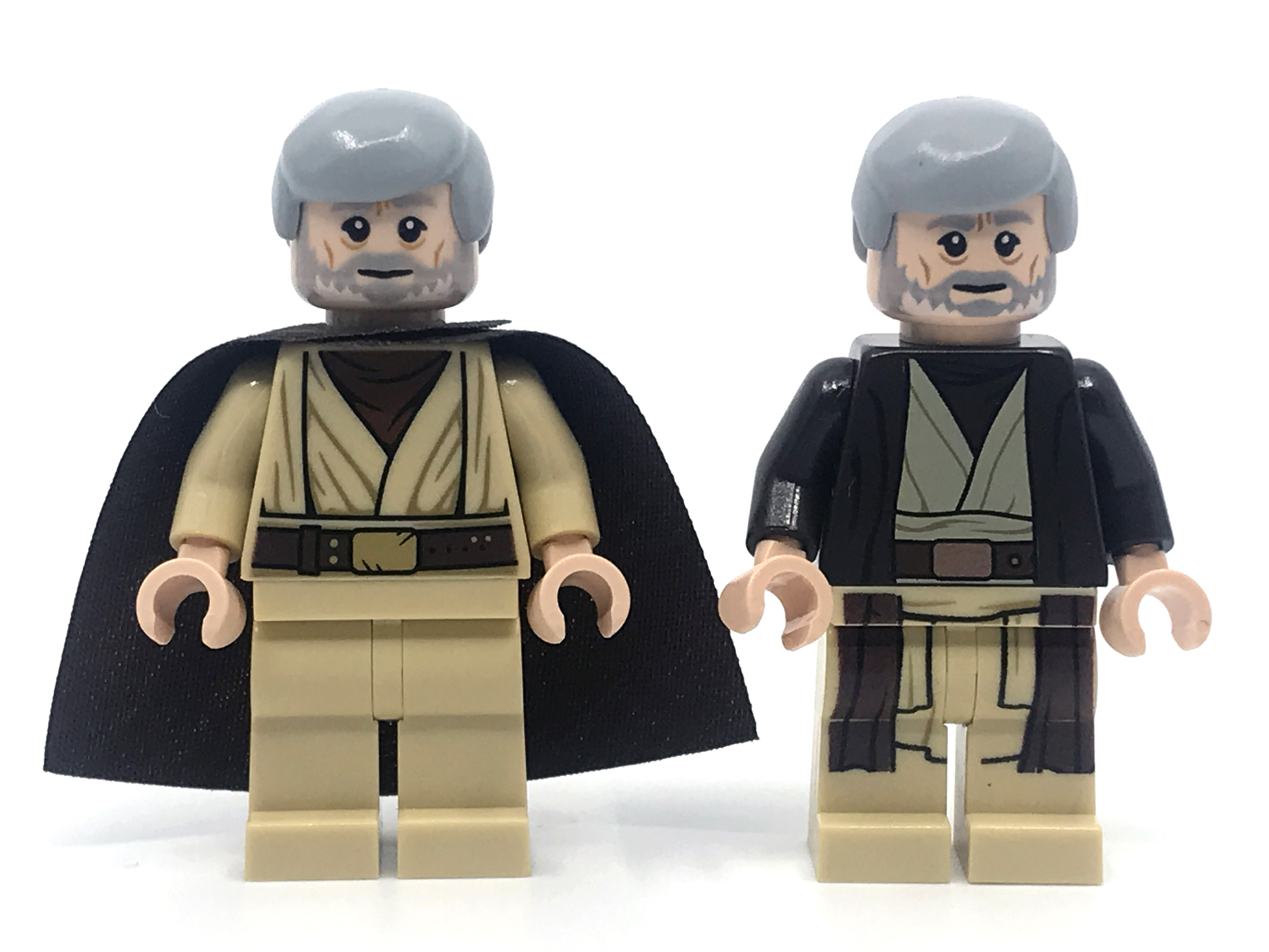 바로 전 버전 오비완 케노비 미니피겨와 비교. 이전 버전은 로브를 입은 상태를 기반의 미니피겨로 제작된 특이한 형태였는데, 이번 제품에선 예전의 제품들처럼 로브를 망토처리하는 방식으로 출시되었습니다, 하반신 디테일이 생략된 것도 특징.