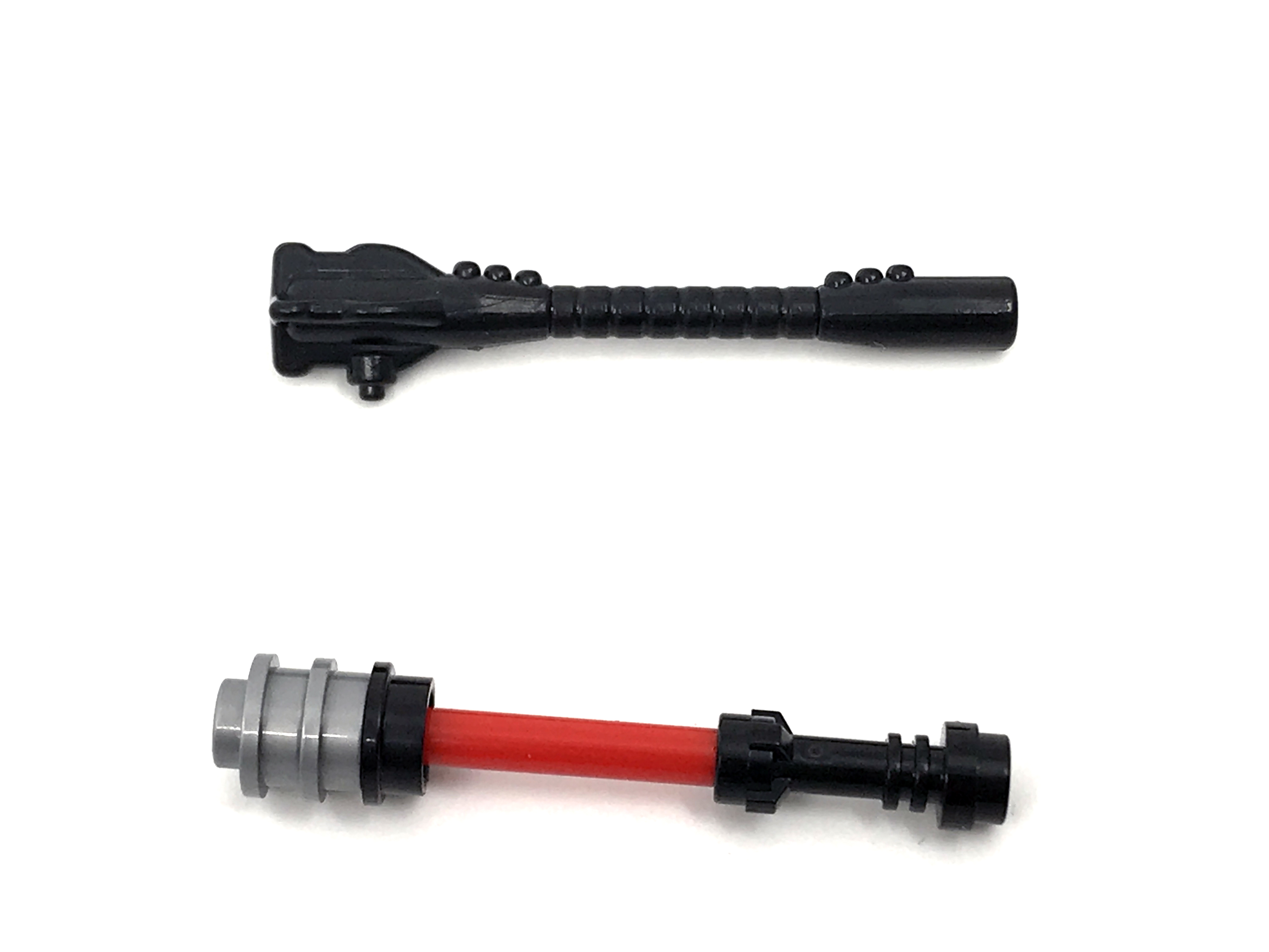 레고에선 빨간 라이트세이버 손잡이와 검은색 발톱, 스터드 부품을 이은 구조라 길이가 조금 짧지요.