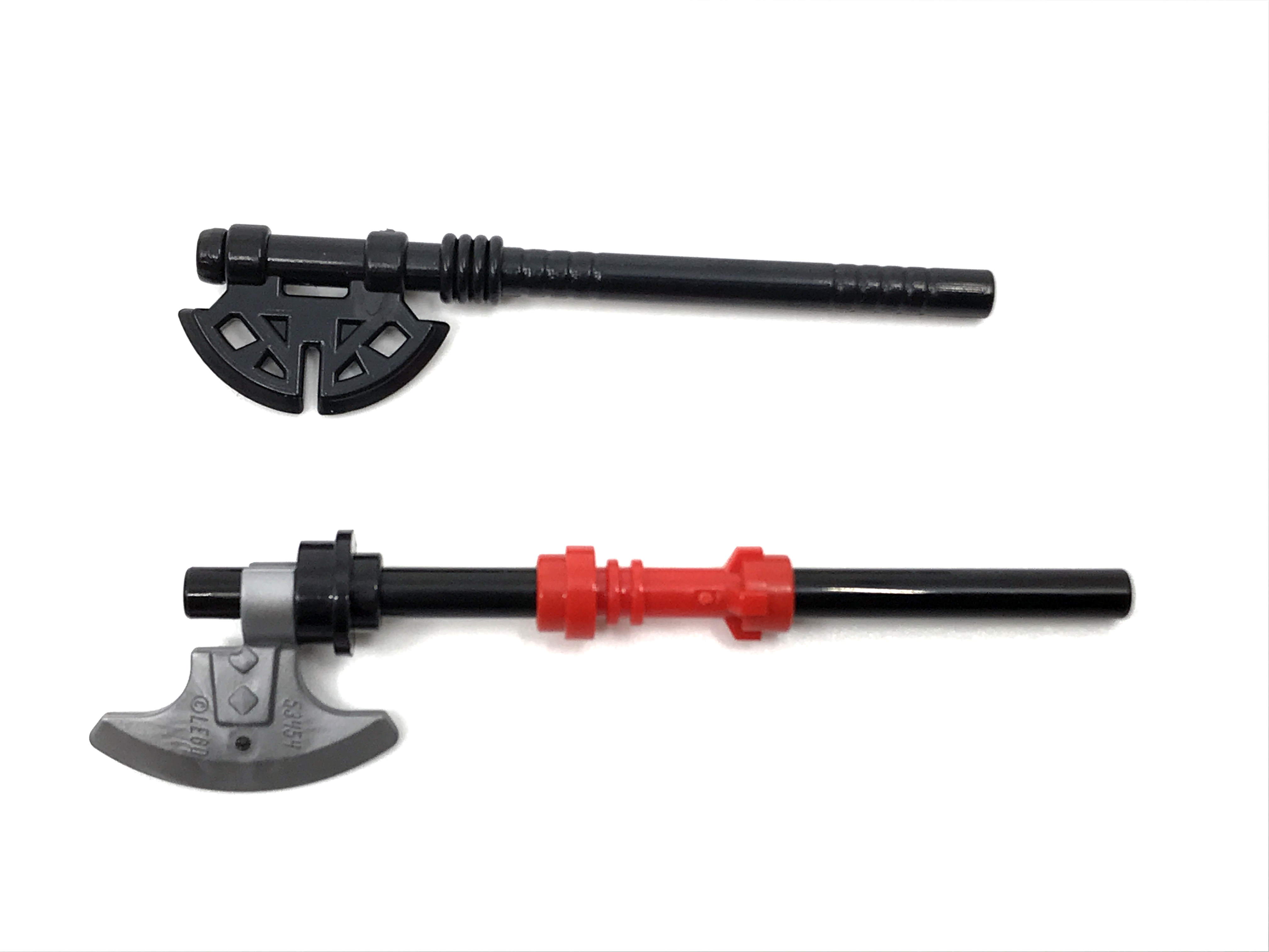 레고에선 빨간 라이트세이버 손잡이에, 3L 바와 도끼날, 구멍난 스터드를 연결해 만든 물건이라, 레고 제품 보다 조금 짧지만, 편의성은 커스텀 제품이 더 뛰어납니다.